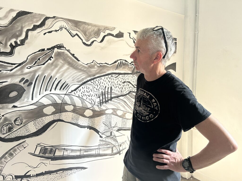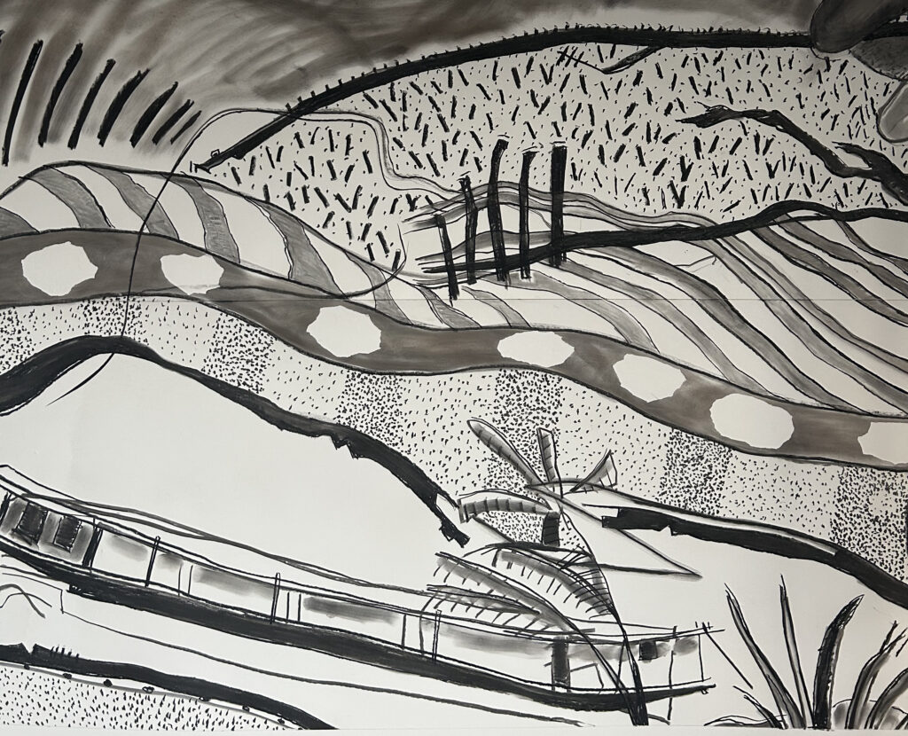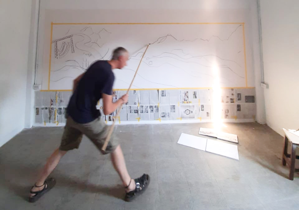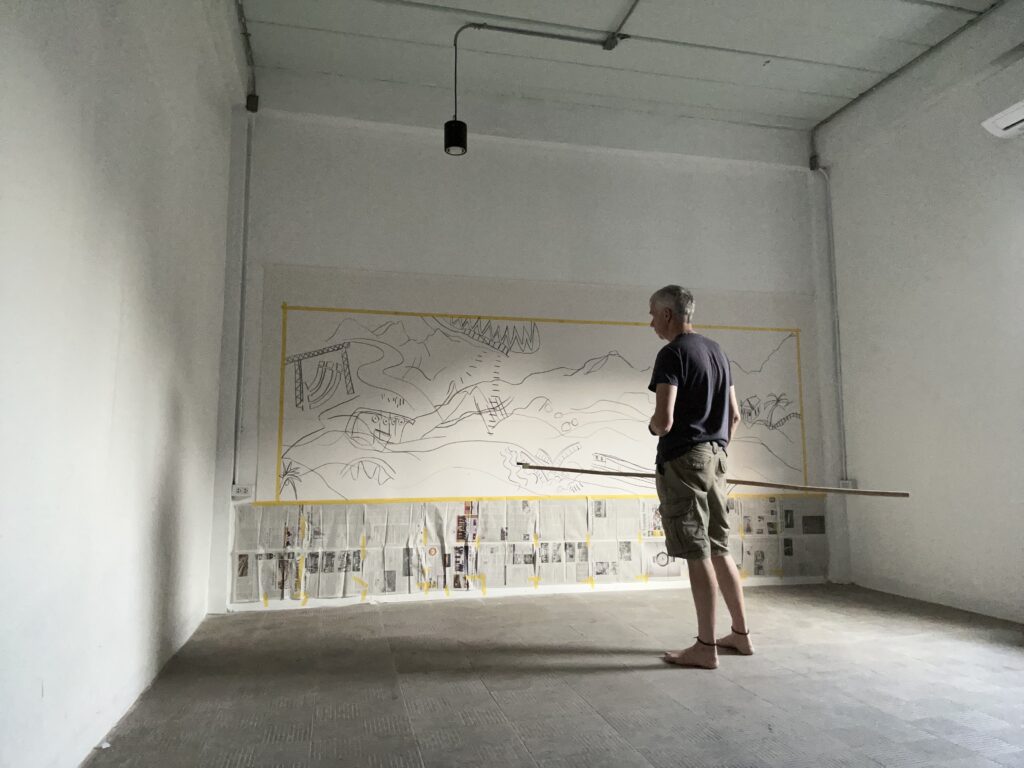 In the early stages, I employed the use of a bamboo stick to enable me to simultaneously stand back to see the work, while at the same time, make large gestural marks across the white paper. The title of the drawing is “Slowboat” – my two friends and I had taken the slowboat from Huay Xai to Luang Prabang the week before arriving in Vientiane.