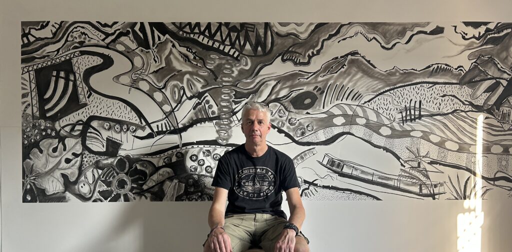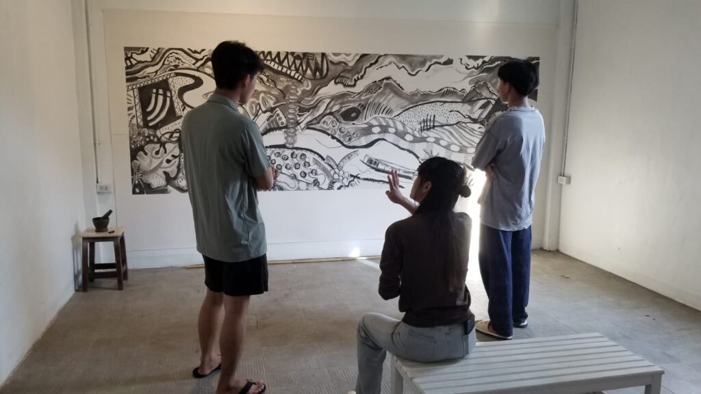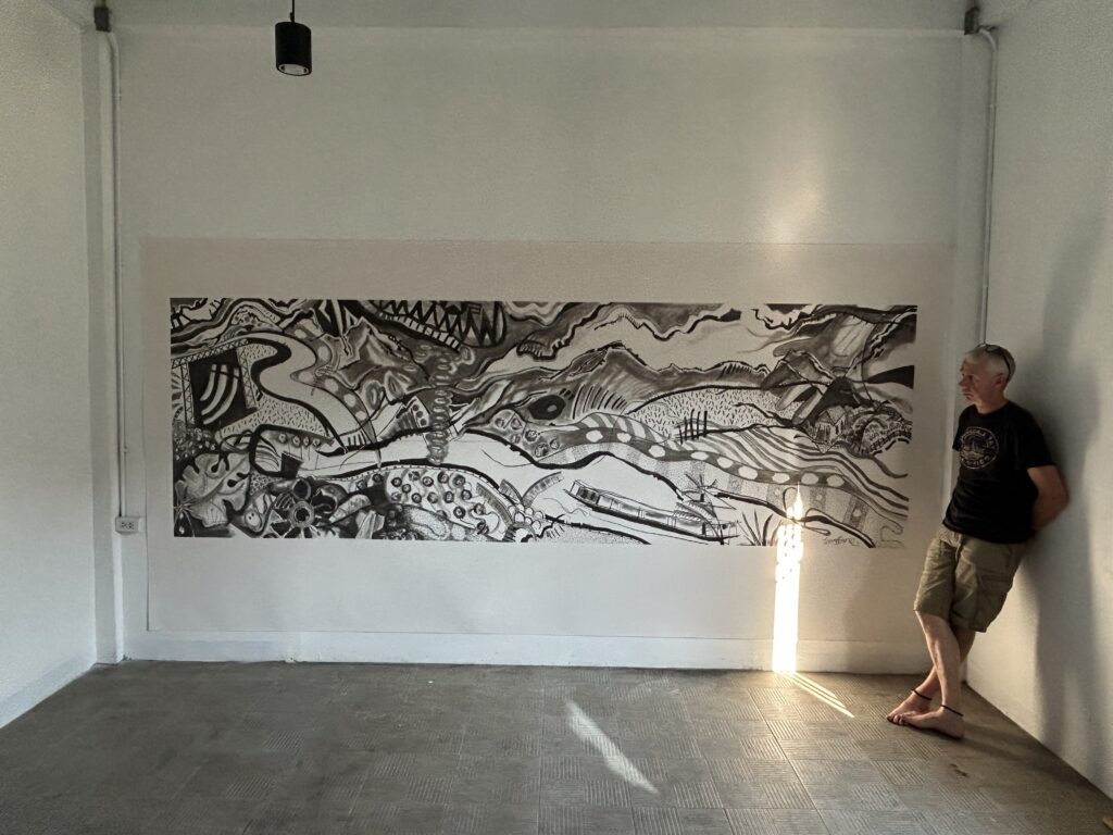 If you’d told me 2 years ago I’d have an art residency in a gallery in Vientiane the capital of Laos, there’s no way I’d have believed you. Yet a few months later, I found myself cycling through the bustling, potholed streets of one of my favourite places on earth, with charcoal, fixative and a gallery front door key in my backpack, on my way to complete a 4.7m wide charcoal drawing in one room of the i:cat gallery downtown Vientiane.